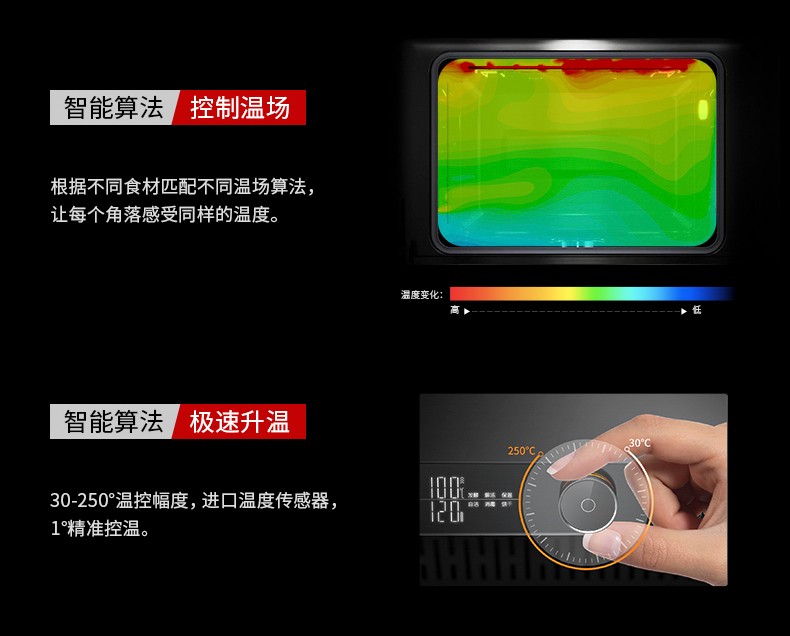 還能開啟“熾熱烘焙”模式,還能烘焙多種蛋糕、甜點等,智能算法極速升溫,30-250°溫控幅度,1°精準控溫,可根據自己口味需求調控,一鍵變身烘焙達人。